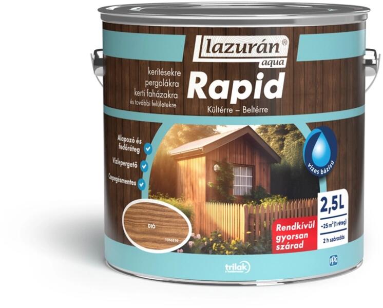 Vizes vékonylazúr kültérre - beltérre A Lazurán Aqua Rapid rendkívül gyorsan száradó vizes bázisú vékonylazúr, melynek bevonata fizikai védelmet nyújt a gombák ellen. Mélyen beszívódik a farostok közé, ezáltal növeli a fafelület vízlepergető hatását, miközben kiemeli a fa eredeti erezetét. Könnyen felhordható, nem csepeg. - Rendkívül gyorsan szárad - Csepegésmentes - Alapozó és fedőréteg - Vízlepergető